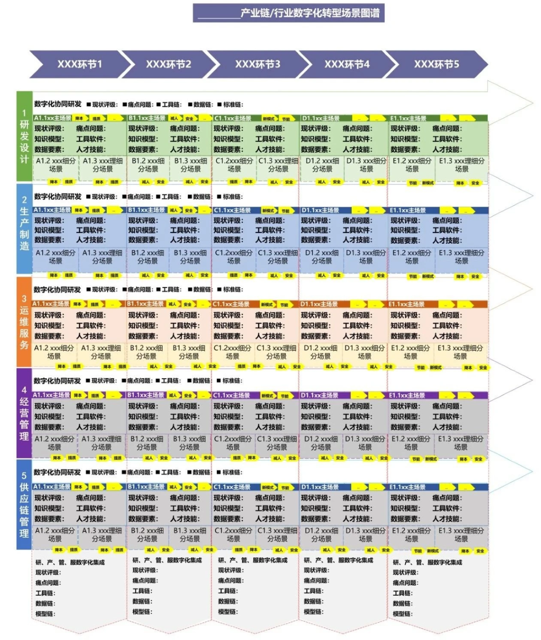 制造業(yè)企業(yè)數(shù)字化轉(zhuǎn)型典型場景參考聚焦產(chǎn)業(yè)鏈上下游企業(yè)研發(fā)設(shè)計、生產(chǎn)制造、運維服務(wù)、經(jīng)營管理、供應(yīng)鏈管理等場景,以場景為切入點梳理數(shù)字化轉(zhuǎn)型痛點需求,繪制重點行業(yè)、重點產(chǎn)業(yè)鏈數(shù)字化轉(zhuǎn)型場景圖譜(簡稱“一圖譜”),明確企業(yè)數(shù)字化轉(zhuǎn)型路徑,促進(jìn)產(chǎn)業(yè)鏈上下游企業(yè)協(xié)同開展轉(zhuǎn)型升級。分場景梳理數(shù)據(jù)要素、知識模型、工具軟件、人才技能等數(shù)字化轉(zhuǎn)型要素清單(簡稱“四清單”,合稱“一圖四清單”),助力政產(chǎn)學(xué)研各界聯(lián)合攻堅場景數(shù)字化轉(zhuǎn)型關(guān)鍵難點。