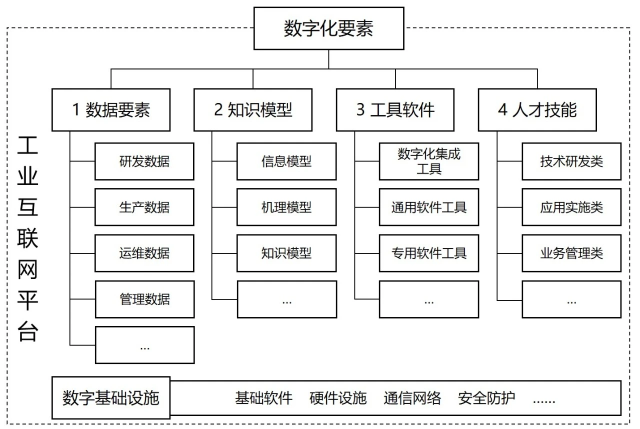 場景的數(shù)字化轉(zhuǎn)型需要相配套的數(shù)字化要素支撐。圍繞場景轉(zhuǎn)型所需的“人、機(jī)、料、法、環(huán)”等資源,將場景數(shù)字化要素劃分為數(shù)據(jù)要素、知識模型、工具軟件、人才技能等4類要素以及數(shù)字基礎(chǔ)設(shè)施保障(如圖2所示)。